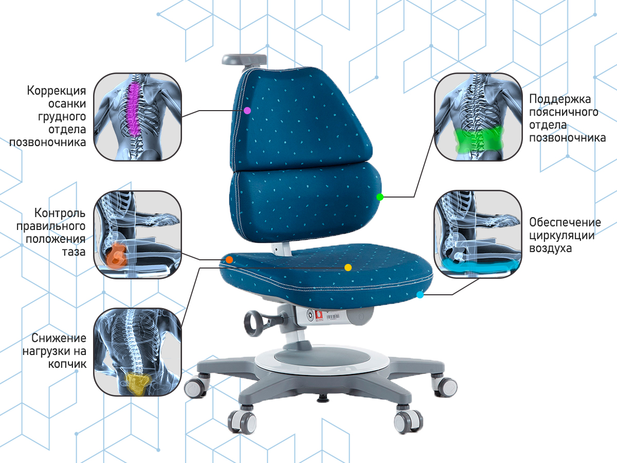 Ego - прекрасный образец заботы о детском здоровье. Основной упор создатели кресла сделали на формирование и поддержание правильной осанки и снятие усталости с мышц спины и таза. Благодаря двойной анатомической спинке уникальной формы, ребёнок не сможет ёрзать и принимать неестественные положения, что снижает риск каких-либо деформаций и микротравм. Таким образом, снижается угроза формирования серьёзных хронических заболеваний, как сколиоз или остеохондроз.